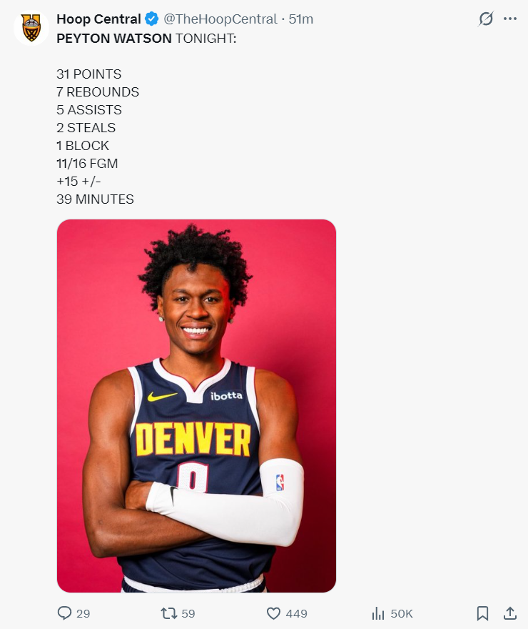 这场比赛23岁的沃特森39分钟,16中11,三分4中1,罚球9中8,拿到31分7篮板5助攻2抢断1盖帽,命中率68.8%,真实命中率77.7%,正负值+15,身高2.03米的沃特森已经成为掘金的一块砖哪里需要哪里搬,在约基奇、穆雷相继缺席的场次里他已经从1打到4。