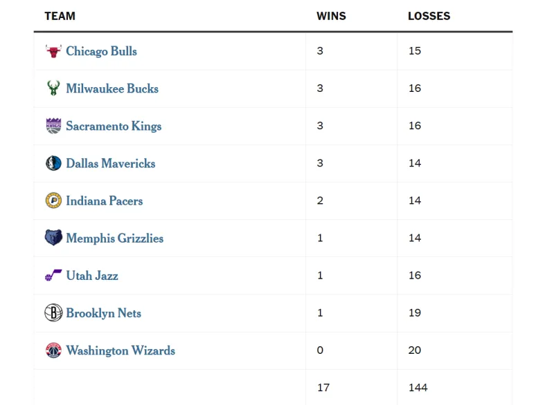 总体而言,这八支摆烂球队自交易截止日以来对阵二十支正统球队的战绩是17胜144负,胜率为10.6%,自全明星赛以来平均输分达到13.9分。而在交易截止日之前,光芝加哥公牛队就赢了18场对阵季后赛二十强的比赛。